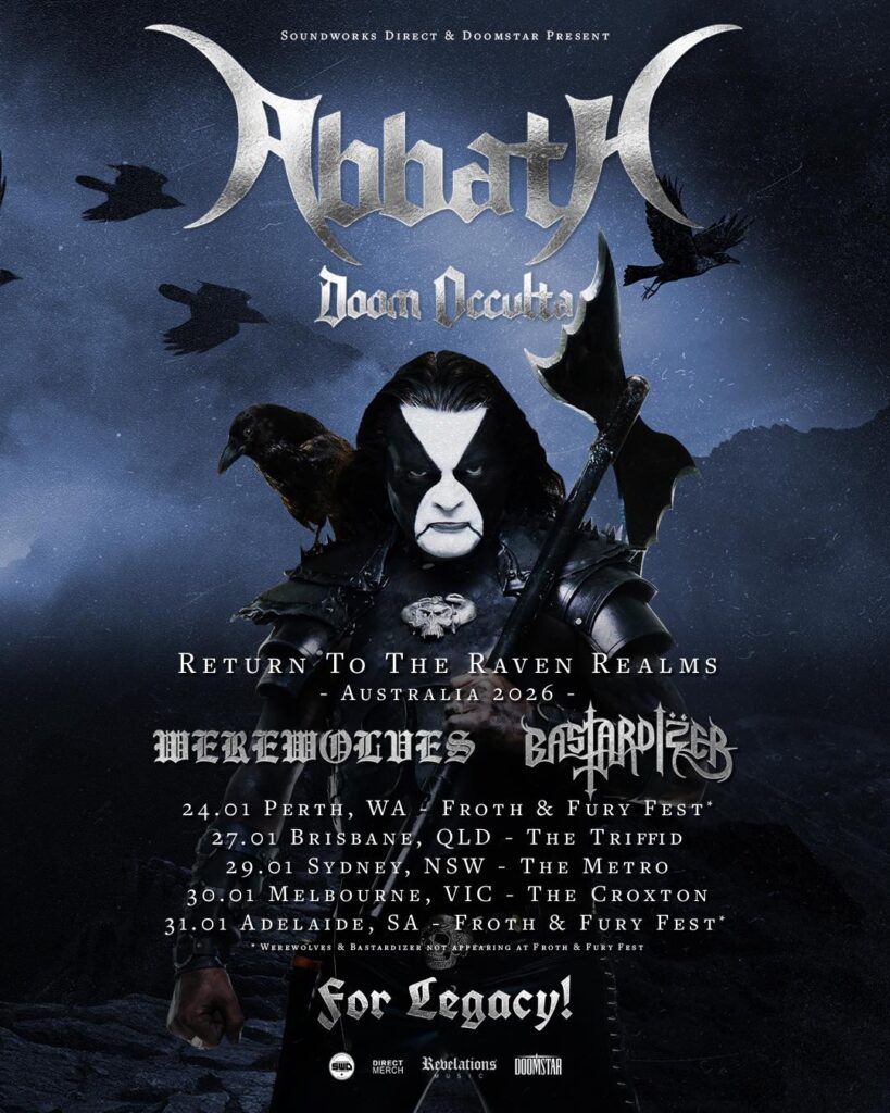 Abbath have announced an Australian tour. Support on non-festival shows will come from Werewolves and Bastardizer.