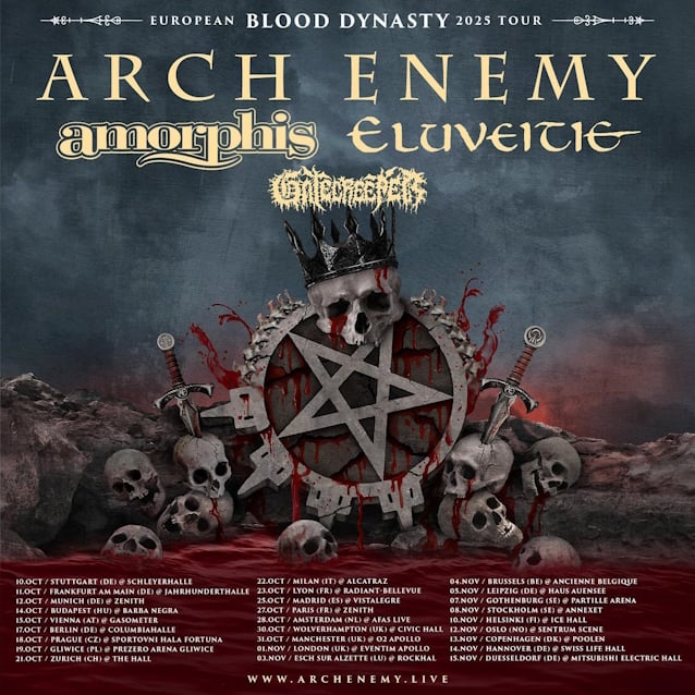 Arch Enemy have announced the “European Blood Dynasty 2025 Tour”. Support on the tour will come from Amorphis, Eluvritie and Gatecreeper.