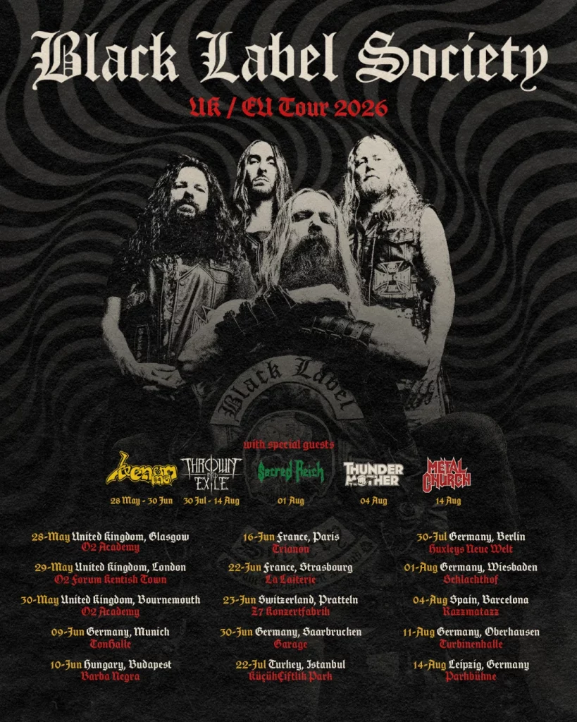 Black Label Society have announced an EU/UK tour for the Spring. Support will come from Venom Inc., Metal Church, Thrown Into Exile, Sacred Reich and Thundermother on select dates.