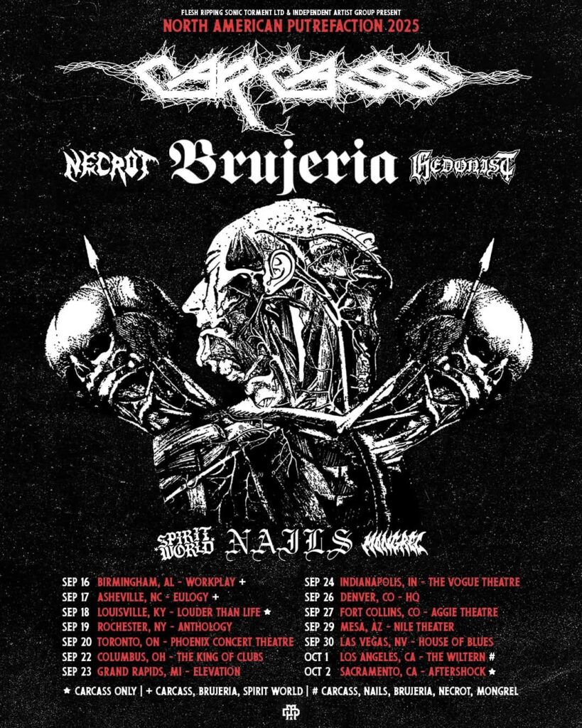 Carcass have announced a North American tour for the Fall. Support will come from Brujeria, Necrot, and Hedonist.