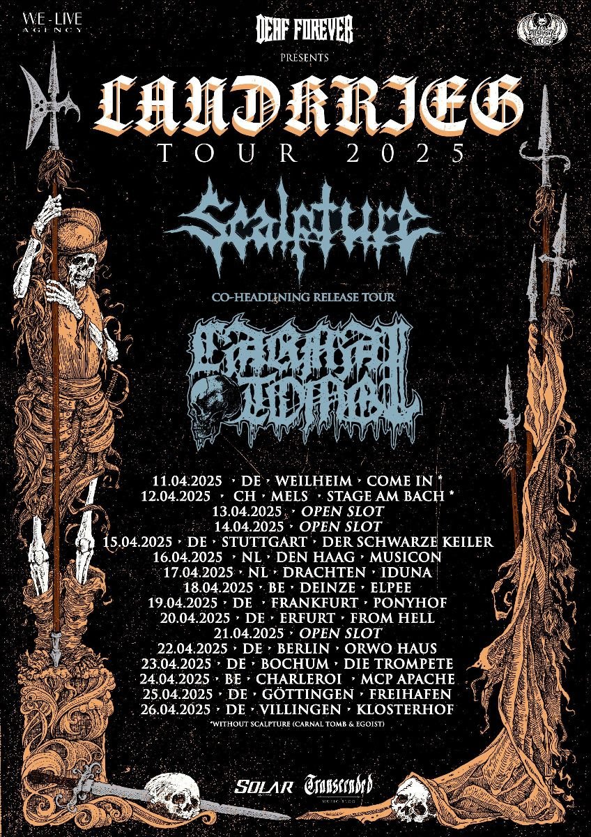 Death metal acts Carnal Tomb and Scalpture will tour Europe in Spring 2025 on the “Landkrieg Tour”.