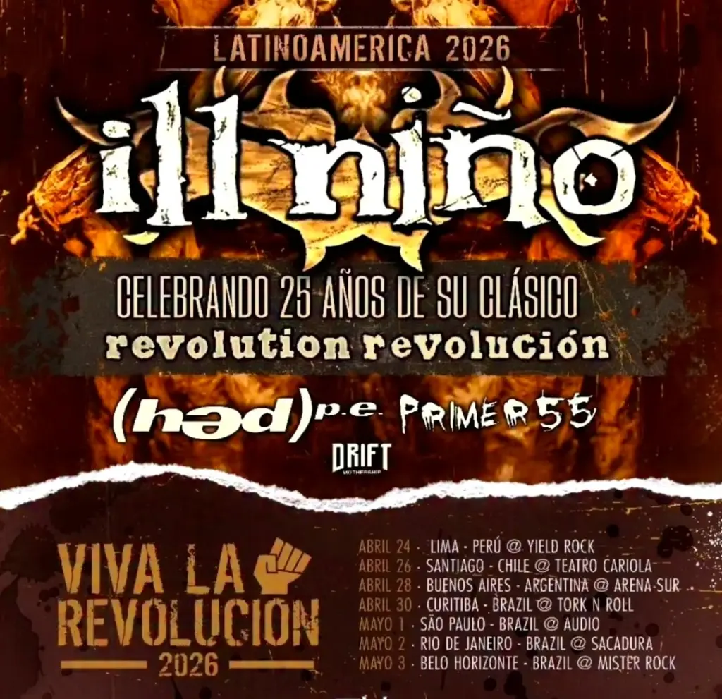Ill Niño have announced a Latin Amewrican tour celebrating the 25th anniversary of “Revolution Revolución”. Support will come from (hed)p.e., Primer 55, and Drift Mothership.