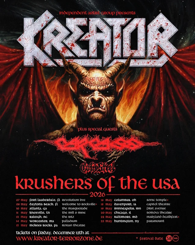 Germany’s Kreator have announced a US tour for late Spring 2026. Support will come from Carcass and Cold Steel.