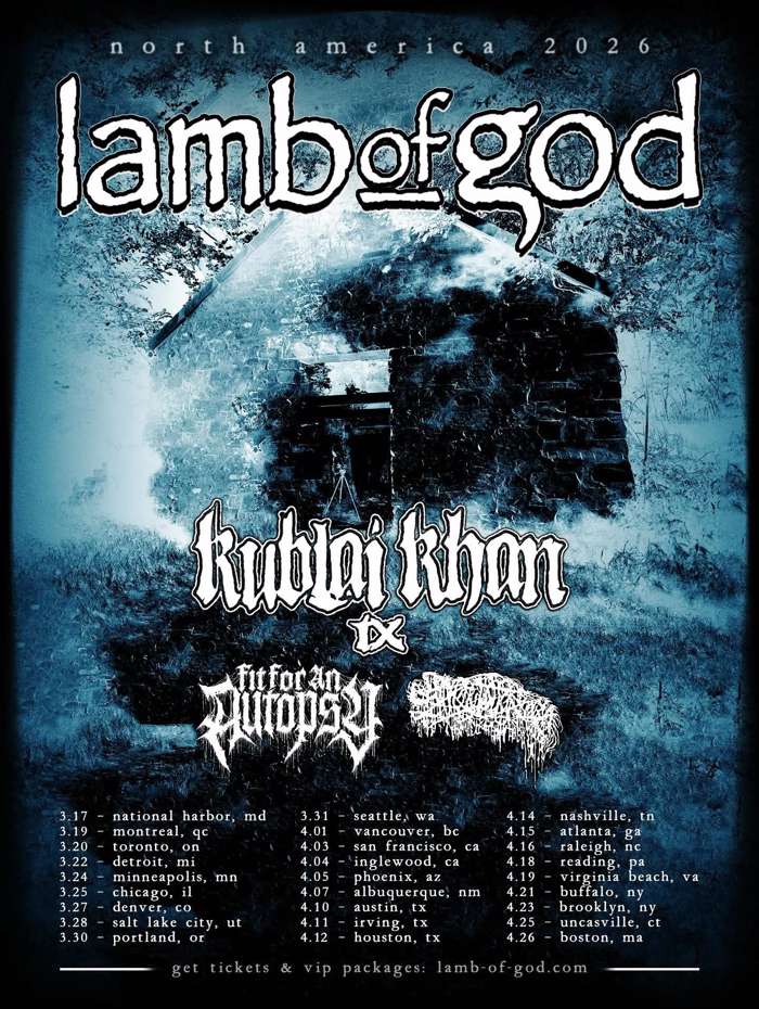Lamb of God have announced a North American tour for early 2026. Support will come from Kublai Khan TX, Fit for an Autopsy, and Sanguisugabogg.