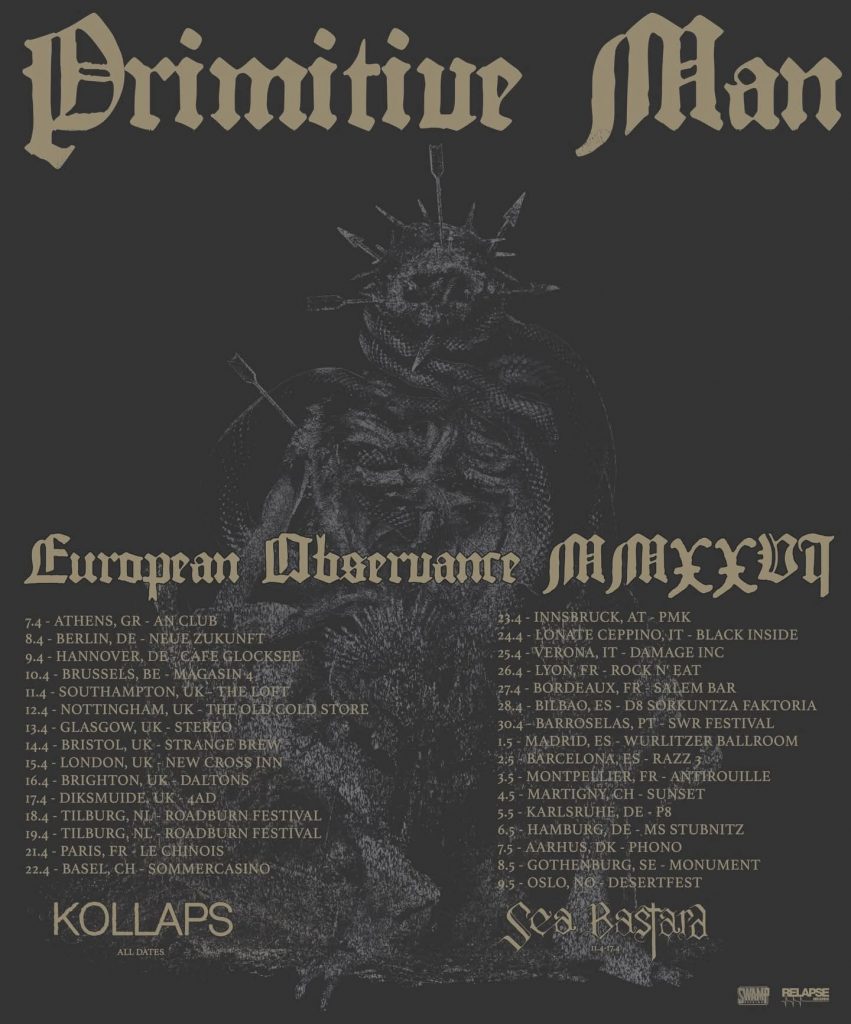 Primitive Man have announced a EU/UK tour for Spring 2026. Support will come Kollaps on allshows, with Sea Bastard joining on the UK dates.