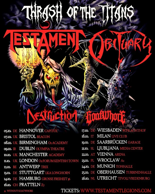 Testament and Obituary have been announced as headliners for the latest installment of the “Thrash of the Titans” tour, taking place in EU/UK this Fall. Support will come from Destruction and Goatwhore.